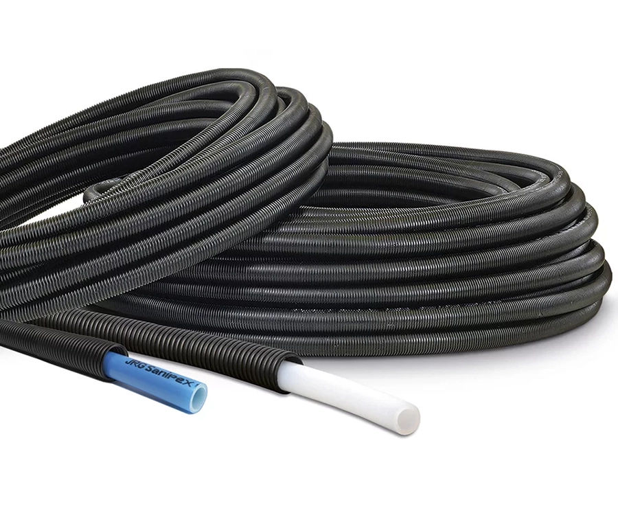 JRG Sanipex - The water-carrying inner pipe made of cross-linked polyethylene (PE-X) is encased in a protective conduit
